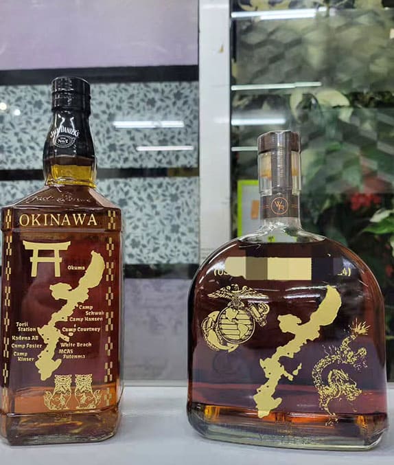 安間商店は、創業63年の歴史を持つ沖縄県うるま市の酒屋です。一階では、オリオンビールをはじめとした地元ならではのビールやウイスキーなどのお酒を小売り・卸売りでご提供。特に、国内外の著名人からも人気のプレミアムテキーラ「CLASE Azul」や、特別な贈り物に最適なサンドブラスト彫刻によるオリジナルボトルの注文も承っております。