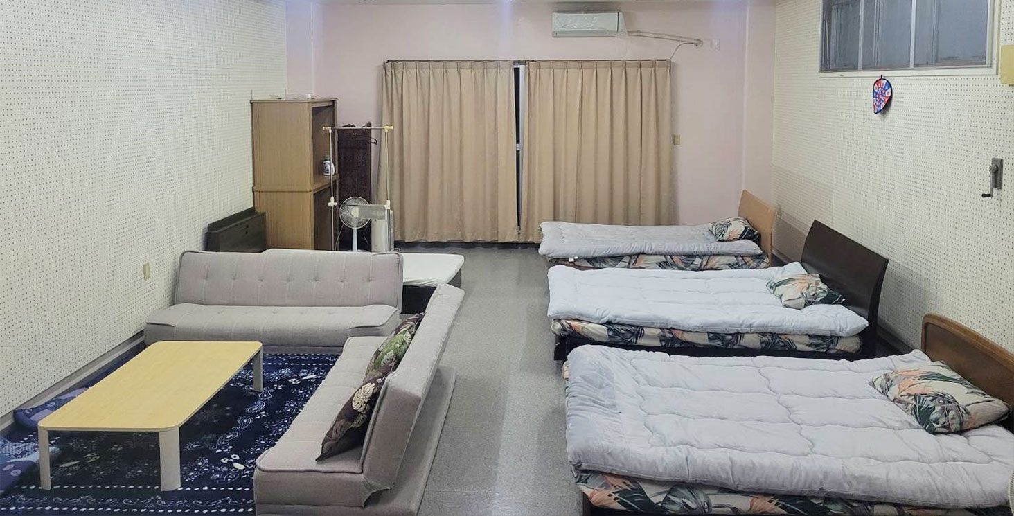 民宿 酒の家は、沖縄県うるま市の酒屋「安間商店」の2階で営業する宿泊施設です。広々とした40畳の空間にキッチンが備わり、友人やご家族での滞在に最適です。