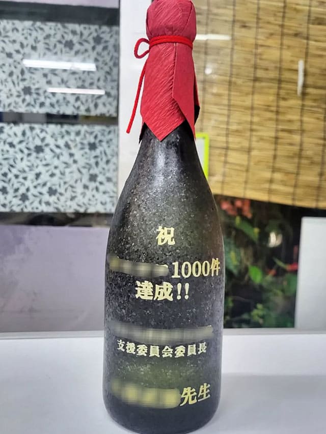 安間商店では、特別な贈り物や記念品に最適なサンドブラスト彫刻を承っています。お客様がお持ち込みいただいたお酒や当店で購入されたボトルに対応可能で、結婚記念や誕生記念、成人祝い、生年祝い、退職記念、新築祝いなど、さまざまなシーンでご利用いただけます。